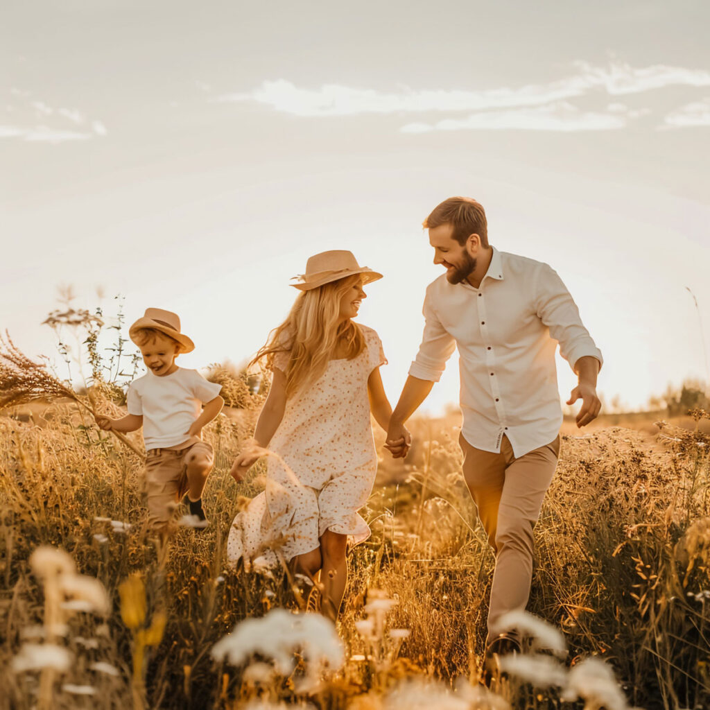 Une famille souriante se retrouve dans un grand jardin fleuri. Les décors sont colorés et harmonieux. La lumière est naturelle et éclatante. Garder fidèlement l’apparence de la photo.